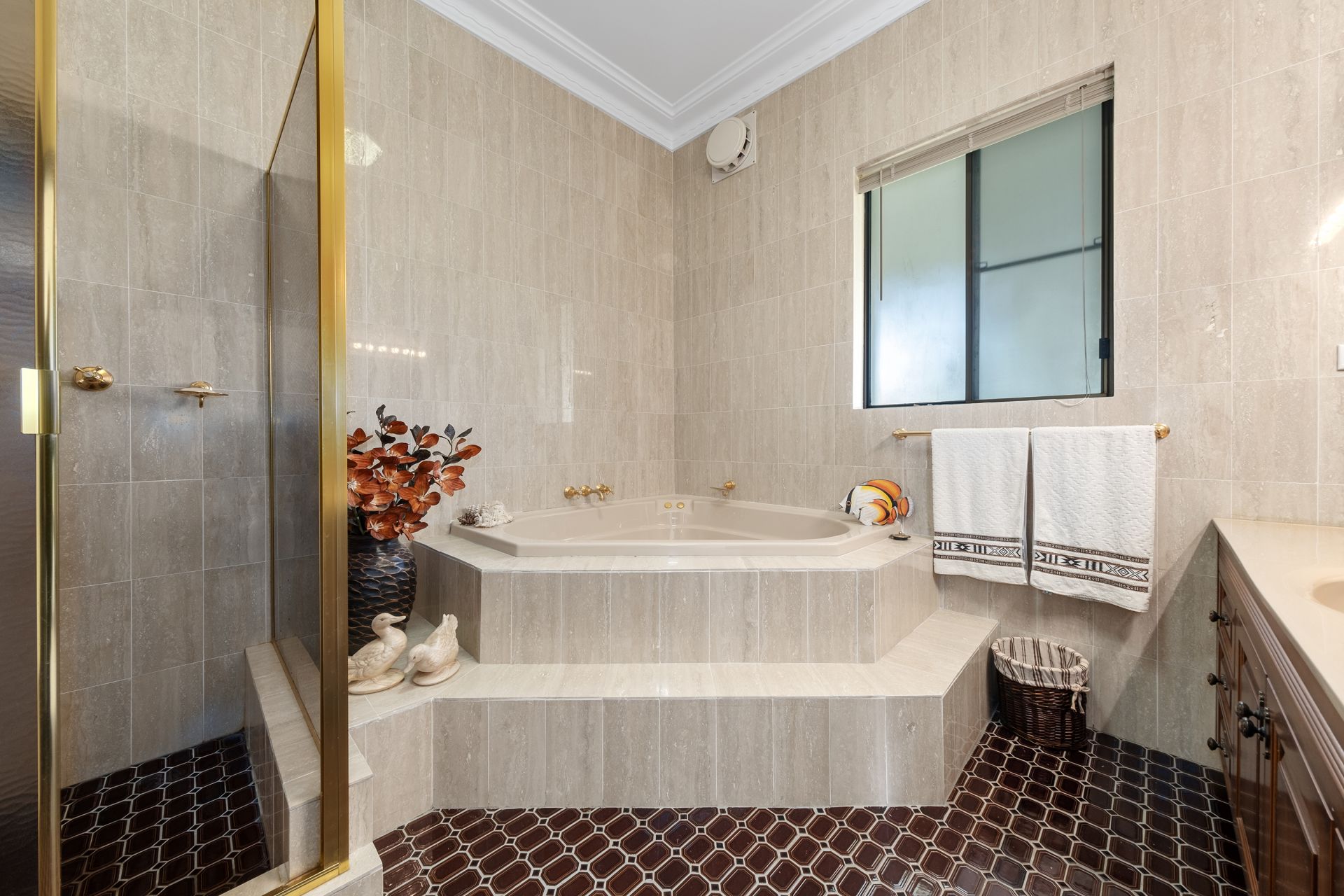 Bedrooms two, three, and four all have built-in robes, offering ample storage space for family members or guests. Bedroom five mirrors the luxury of the master with its own walk-in robe and ensuite, also with floor-to-ceiling tiling. The main bathroom, centrally located for convenience, features a spa bath, ideal for unwinding at the end of a long day, and is similarly tiled from floor to ceiling. A separate toilet enhances functionality for busy family life. Upstairs, ducted air conditioning ensures the home stays cool and comfortable throughout, while 3.2-meter high ceilings throughout the entire house create a sense of spaciousness and grandeur. Overall, this meticulously designed home offers a blend of comfort, luxury, and practical living spaces for a growing family.