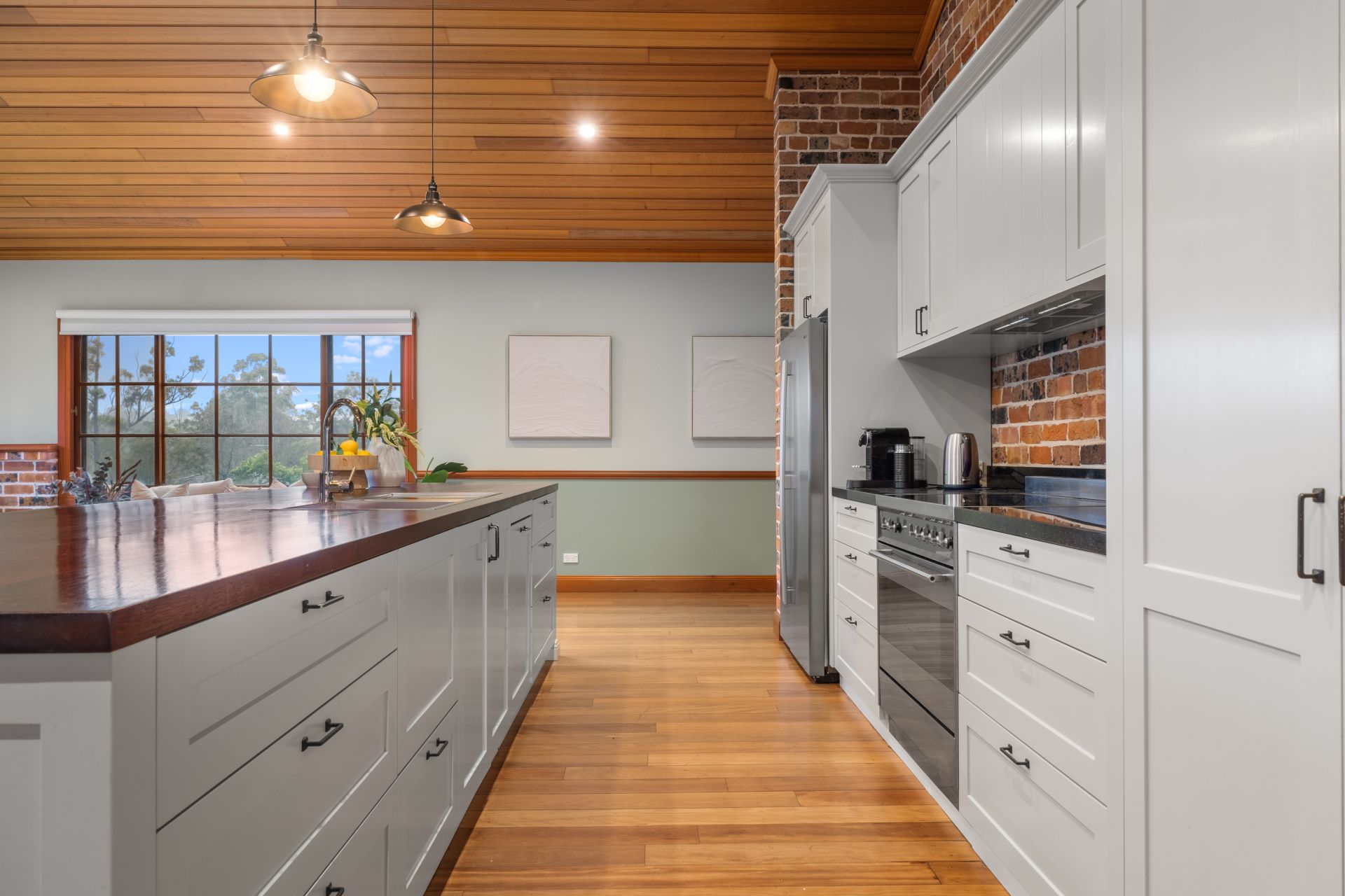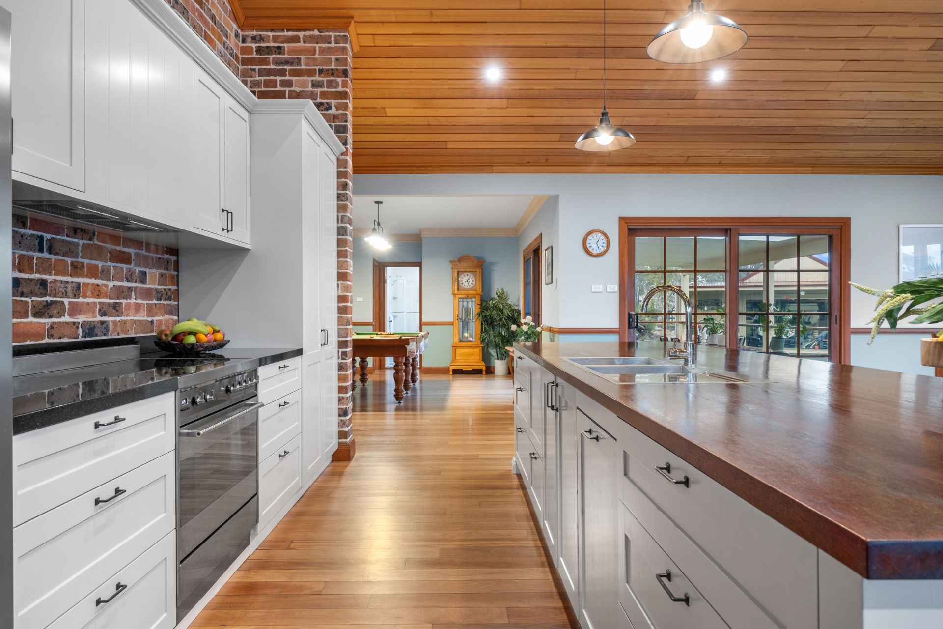 A charming pebble pathway and an impressive full length front veranda leads to a welcoming entry foyer, highlighted by a stunning stained-glass door, detailing that sets the tone for the character and charm found throughout the home. At the heart of the residence lies a spacious open-plan kitchen and living area-enhanced by a Tasmanian oak cathedral ceiling that adds a sense of grandeur, perfect for family connection and everyday living. The kitchen is a true centerpiece, featuring a striking 4.2 m x 1.2m island bench with breakfast bar-blending functionality with timeless style.