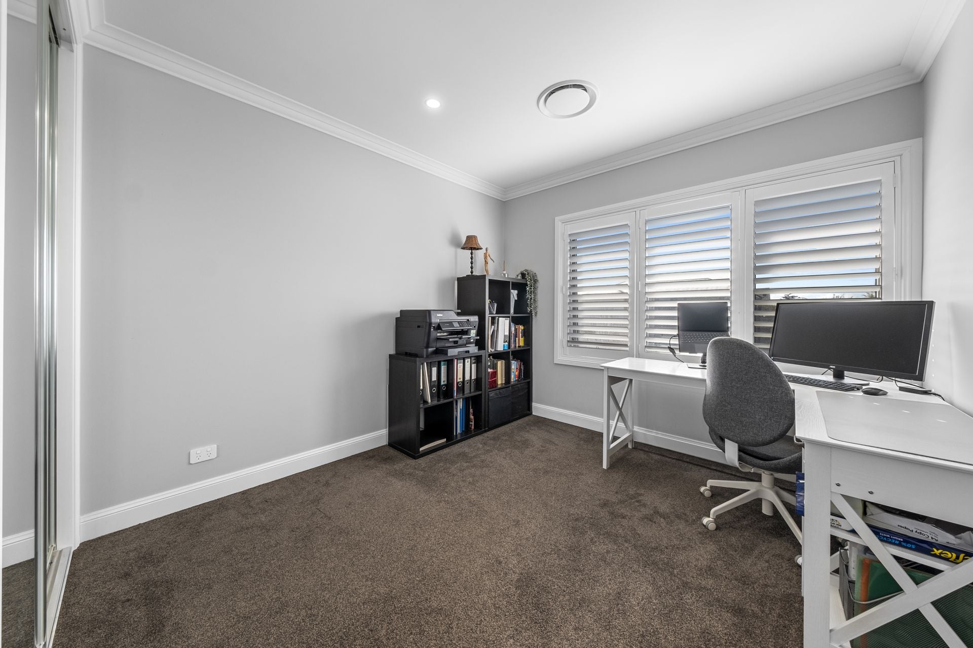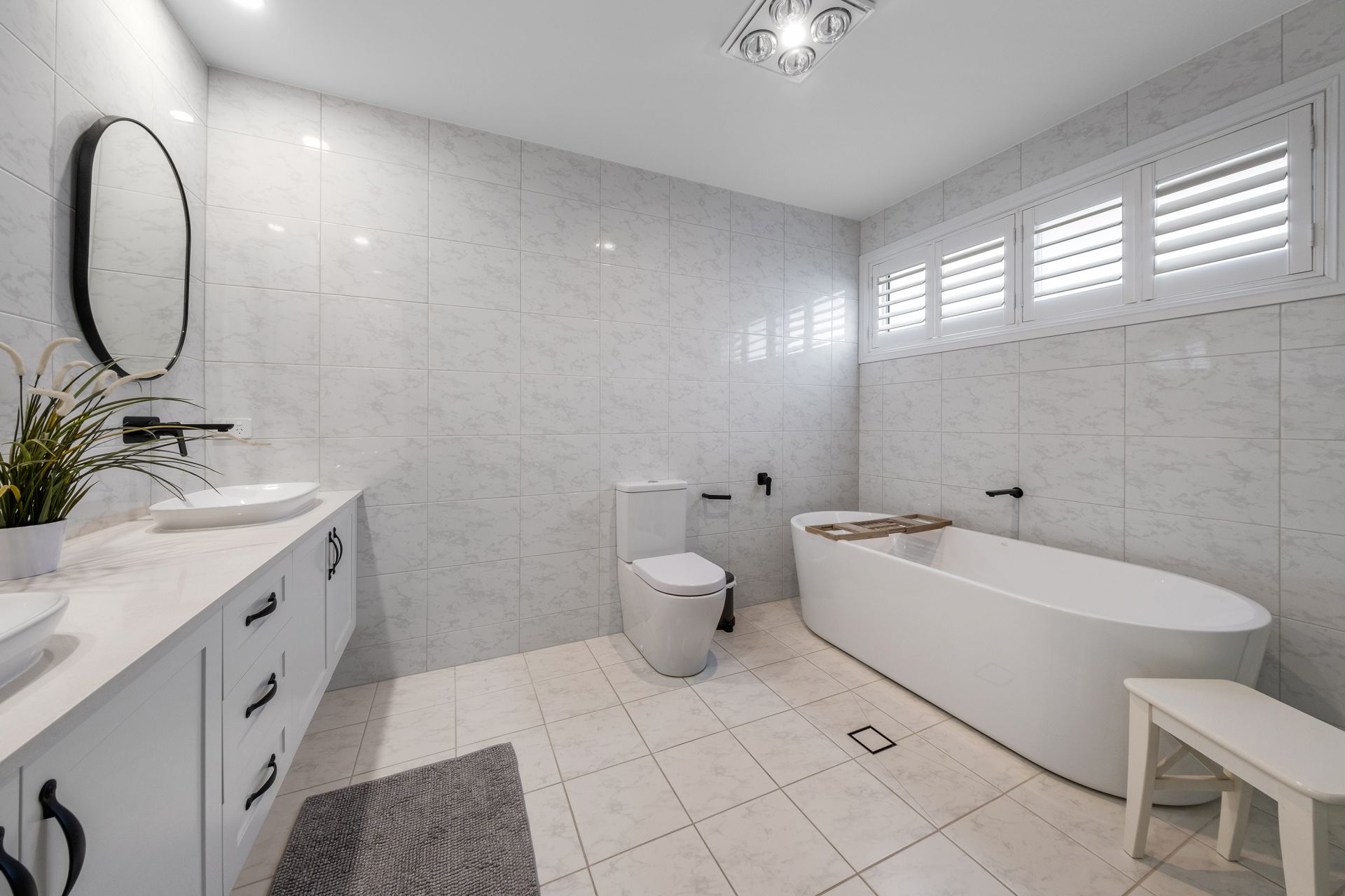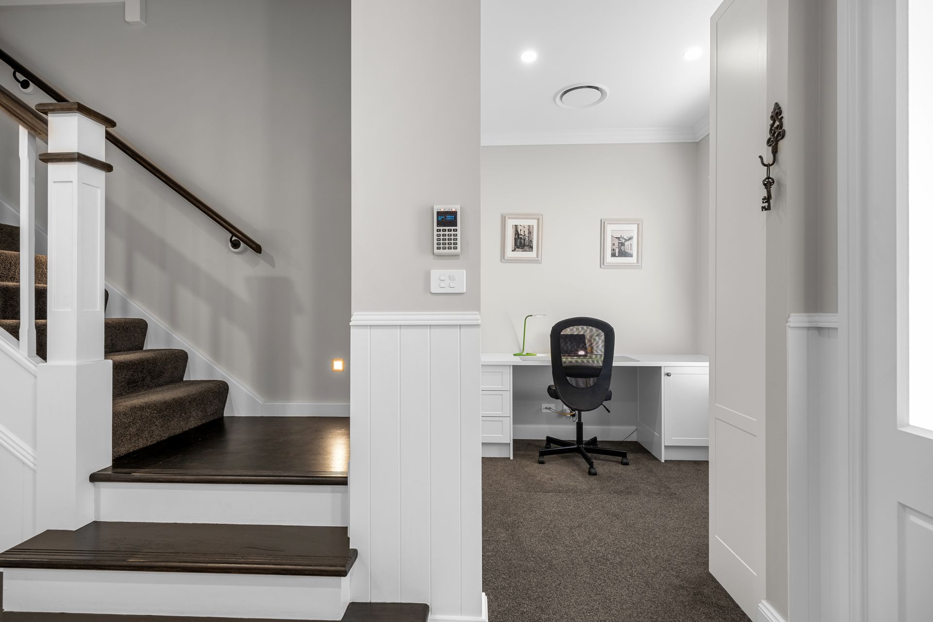 Accommodation is generous and flexible, offering four oversized bedrooms plus a versatile fifth room, perfect as a home gym, guest room or second office. The luxurious master suite features a walk-in robe, a stunning ensuite with floor-to-ceiling tiles and a freestanding bath, plus its own private balcony. Bedroom 2 includes a fitted walk-in robe, Bedroom 3 offers a built-in robe, and Bedroom 4-located on the ground floor-features its own built-in robe, making it ideal for guests or multigenerational living. Additional highlights include a designer main bathroom upstairs, guest bathroom downstairs, an upstairs lounge/kids' retreat, and a dedicated home office with built-in desk and shelving. Even the laundry has been cleverly designed, featuring a laundry chute from the upper level for added convenience.