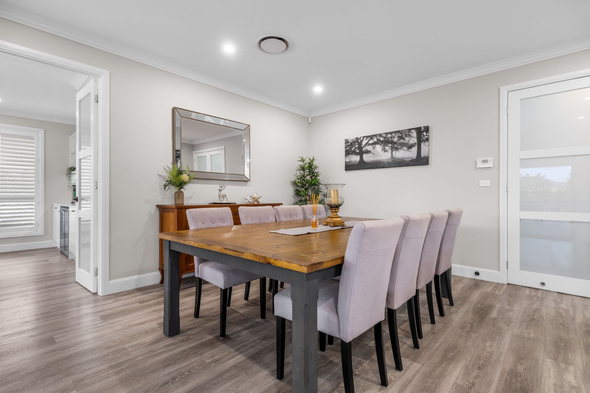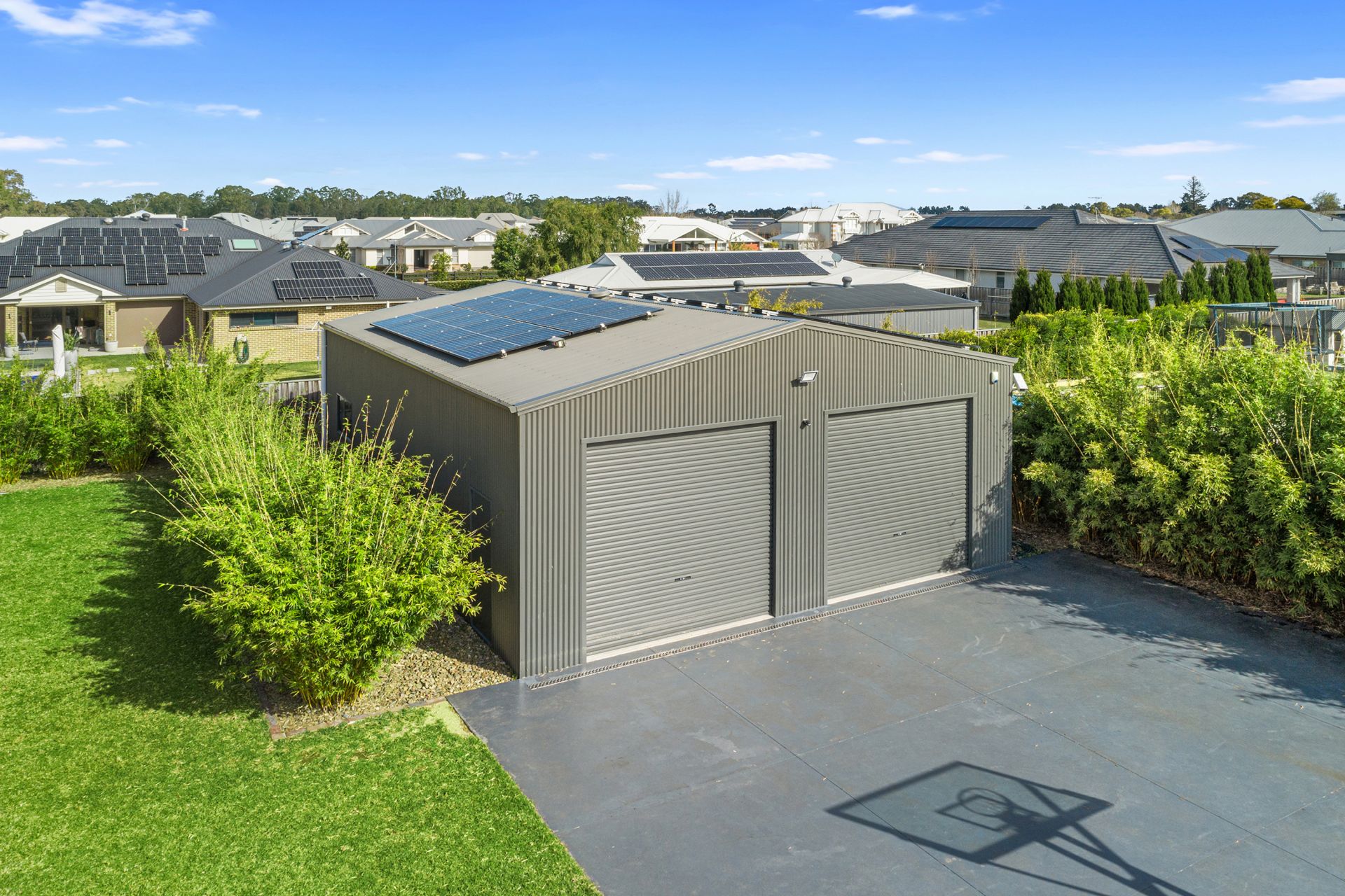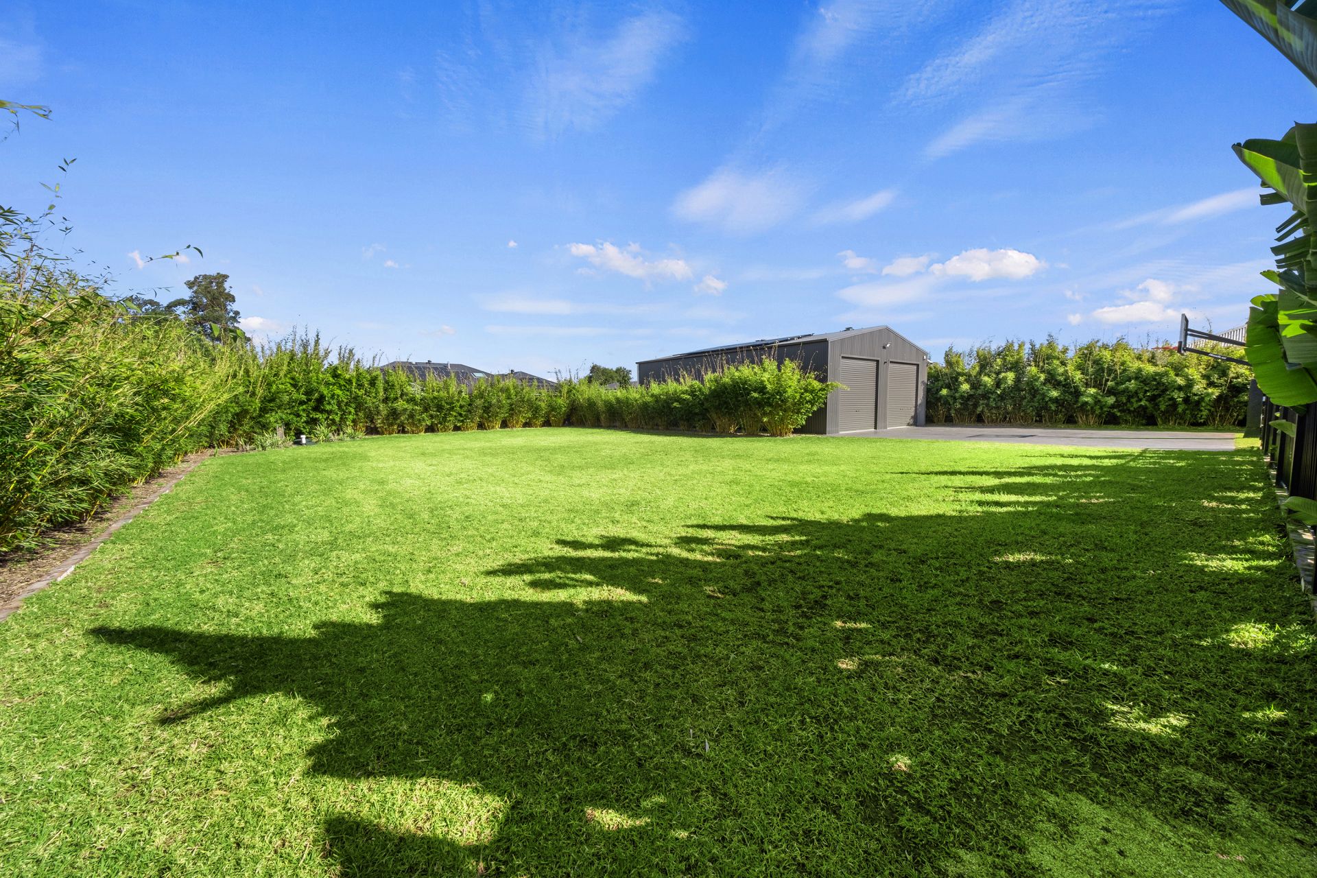 Outdoors, the attention to detail continues. A three-car garage with internal access, extra-height doors, and drive-through capability accommodates larger vehicles with ease. A 12x9m shed with a pitched roof and 3-phase power provides the ultimate workspace for trades or car enthusiasts. The concrete driveway leads to custom steel automatic gates, offering both convenience and security. Completing the package is a commercial-grade security system, automated irrigation with electric pump, town and recycled water connections, and full fencing, ensuring peace of mind and effortless upkeep.