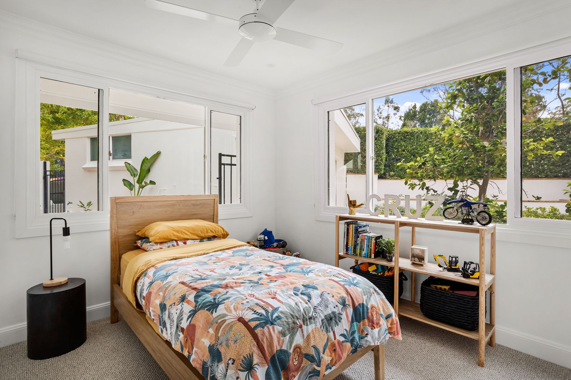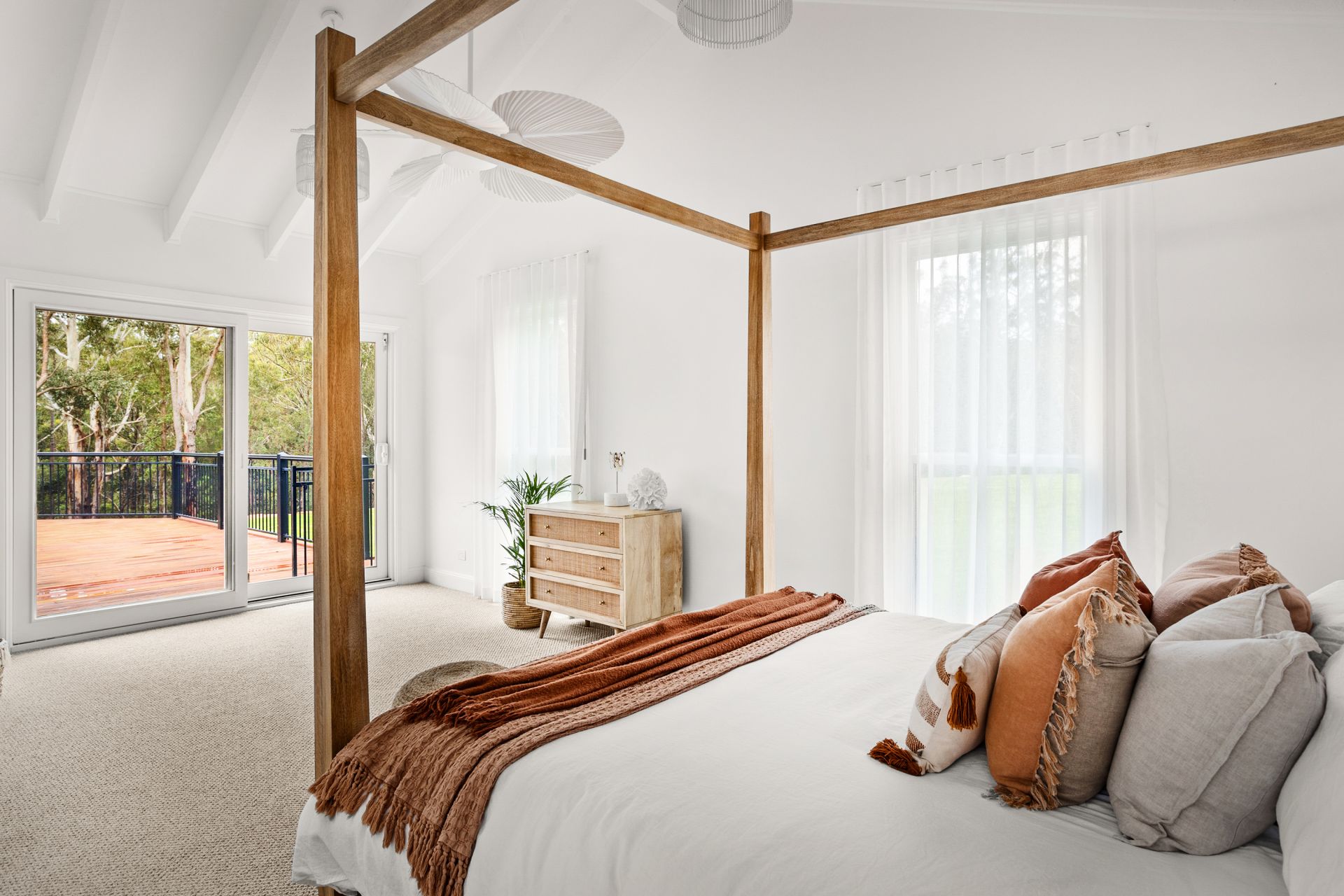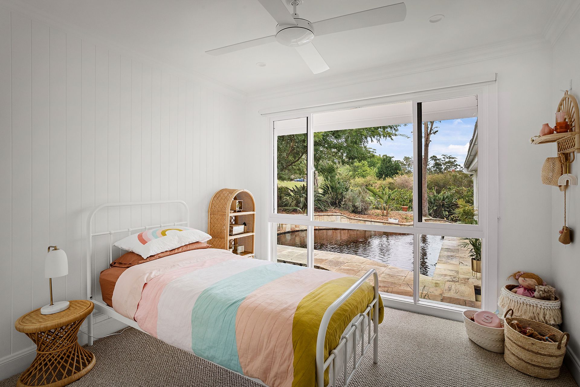 The single-level residence has been fully renovated and finished with a rendered exterior, colorbond roof, and timeless neutral interiors. A feature bridge pathway over a fish pond leads to the entry foyer, where vaulted and feature ceilings create a sense of light and space. The versatile floor plan includes six bedrooms or five plus a home office, with the master suite offering a walk-in robe, private deck access, and a stylish ensuite. Each additional bedroom includes built-ins and ceiling fans, while the three-way family bathroom caters easily to family living. A fitted out laundry with external access adds convenience.