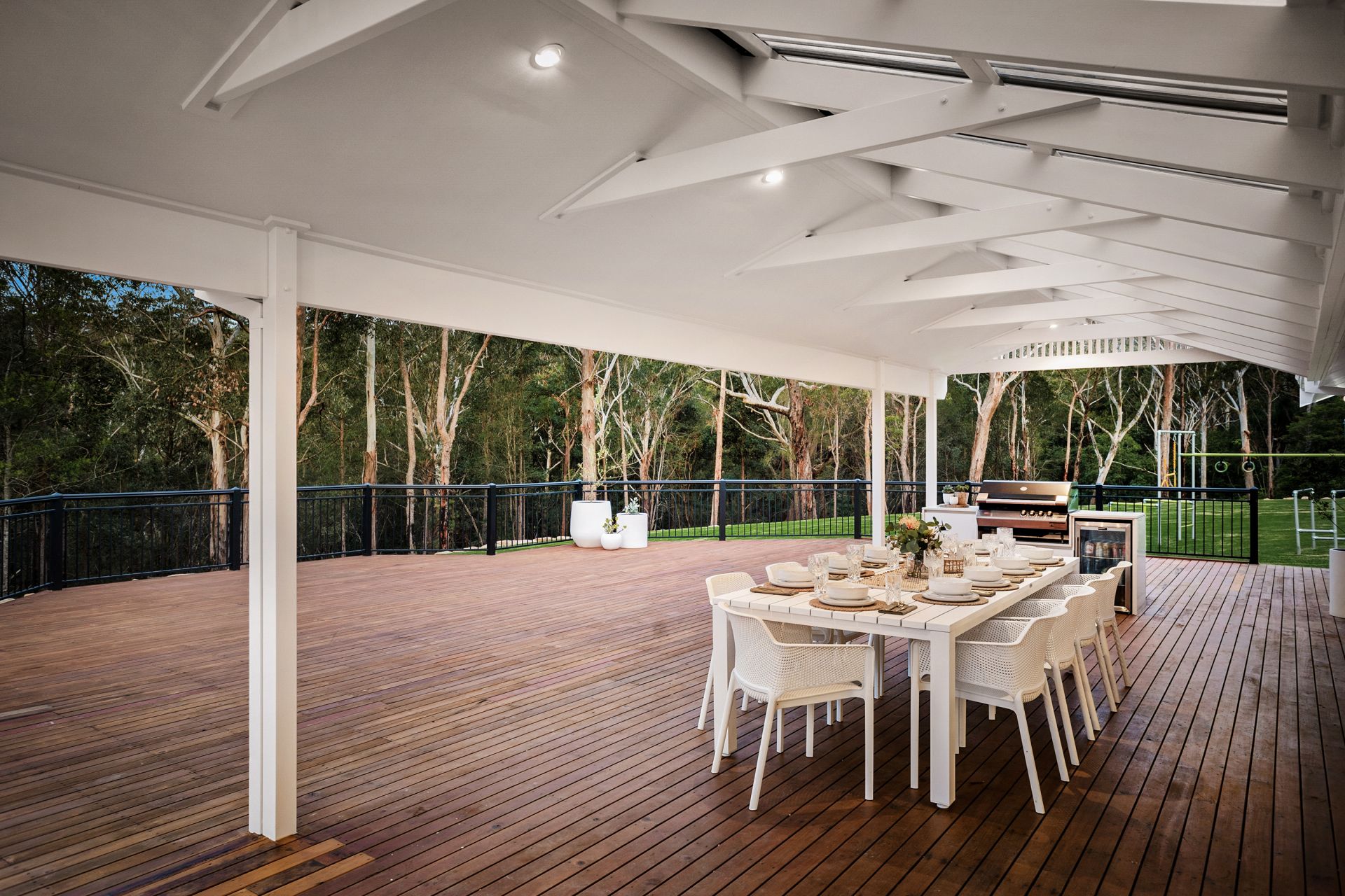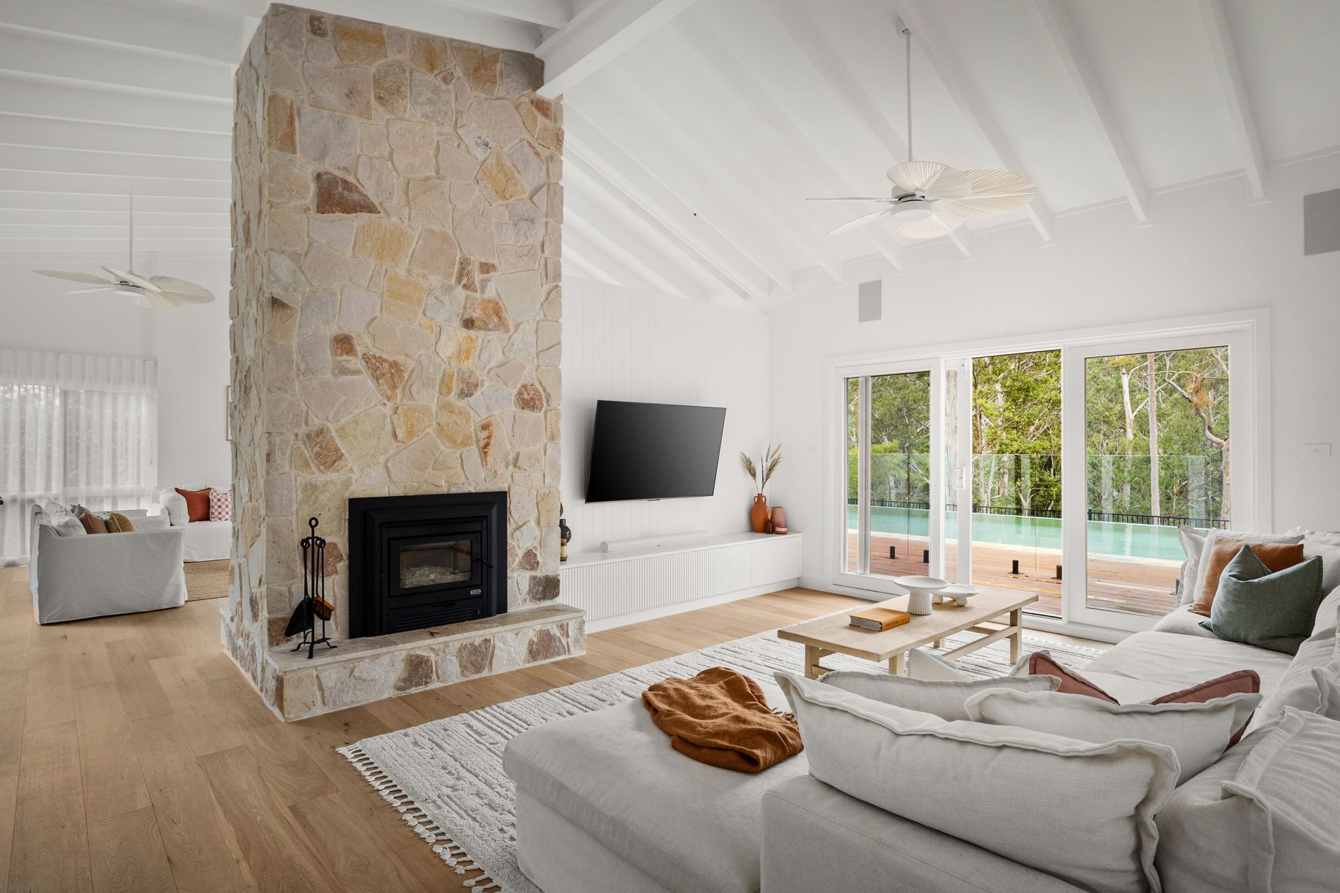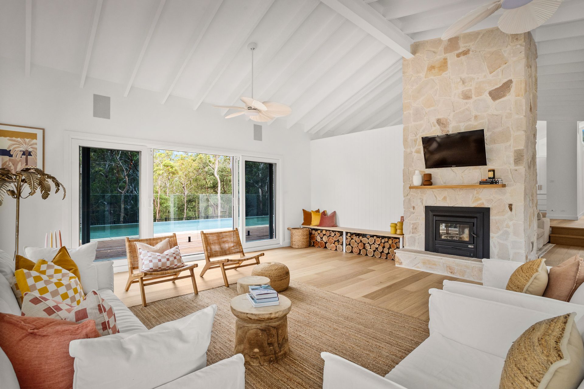 Living areas are warm and inviting, designed with both relaxation and entertaining in mind. The kitchen is a chef's dream, boasting a large island with Caesarstone benchtops, waterfall edging, a 900mm Smeg gas cooktop and oven, butler's pantry with servery window, and thoughtful features like auto lighting in cupboards. The family and lounge rooms each feature slow-combustion fireplaces with stone chimneys, opening out to expansive decks. Outdoors, a covered alfresco area with built-in BBQ overlooks the wet-edge inground swimming pool, complete with glass fencing and sweeping views over the tiered lawns and bushland vista.