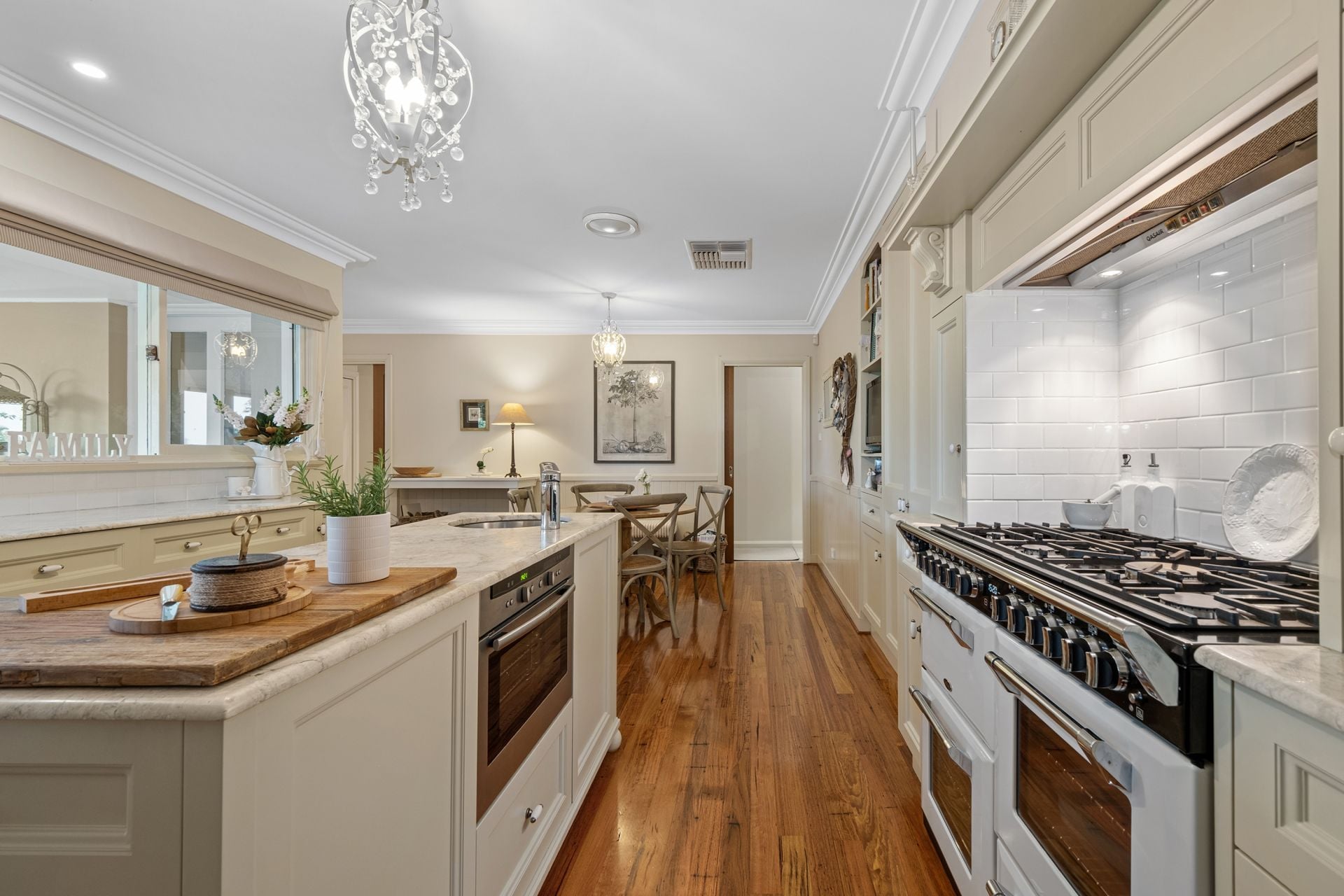 Step inside to an inviting entry foyer leading to a formal lounge with a gas log fireplace and a formal dining room - perfect for relaxed family living or entertaining guests. The heart of the home, the kitchen, features marble bench tops, an island with a sink, ample storage, a 7-plate gas cooktop, four ovens, a steamer, and a second sink - ideal for the avid home chef. Adjoining the kitchen is a meals area and a spacious rumpus/home theatre room with a wood log fireplace and feature-lined ceiling, providing multiple living and entertaining options.