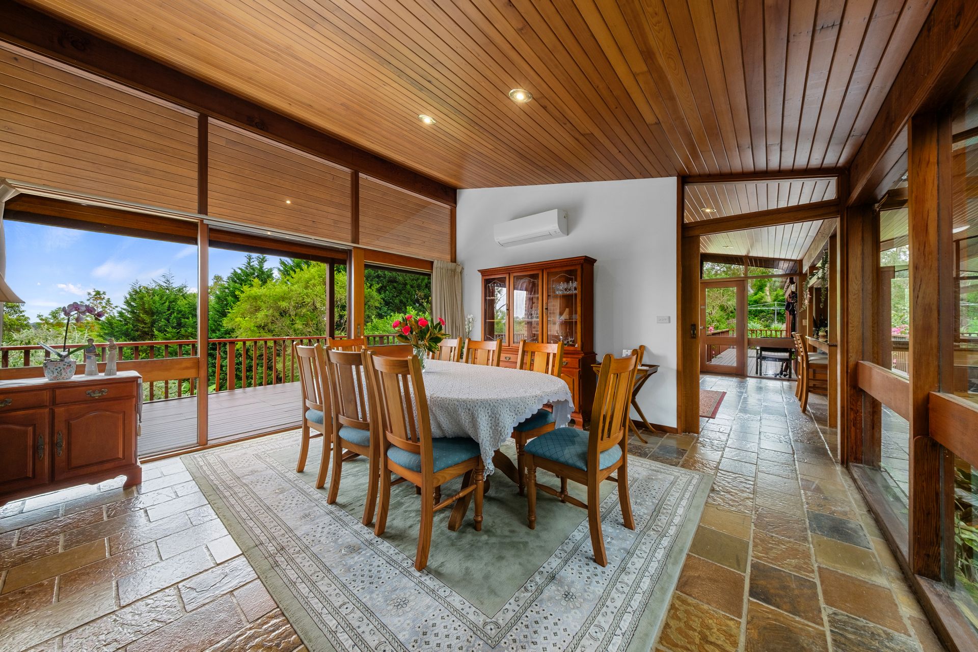 From the moment you step inside, the home welcomes you with vaulted ceilings, warm timber finishes, and open-plan living spaces that flow seamlessly to the outdoors. The timber kitchen and dining area sit at the heart of the home, perfect for family gatherings or entertaining friends, while two expansive living areas open directly onto the full-length back veranda, capturing tranquil views across the property and mountain views. For more formal get togethers there is a formal dining room and formal lounge room. Should kids or parents so desire, there is also a separate TV room which also leads to the veranda.